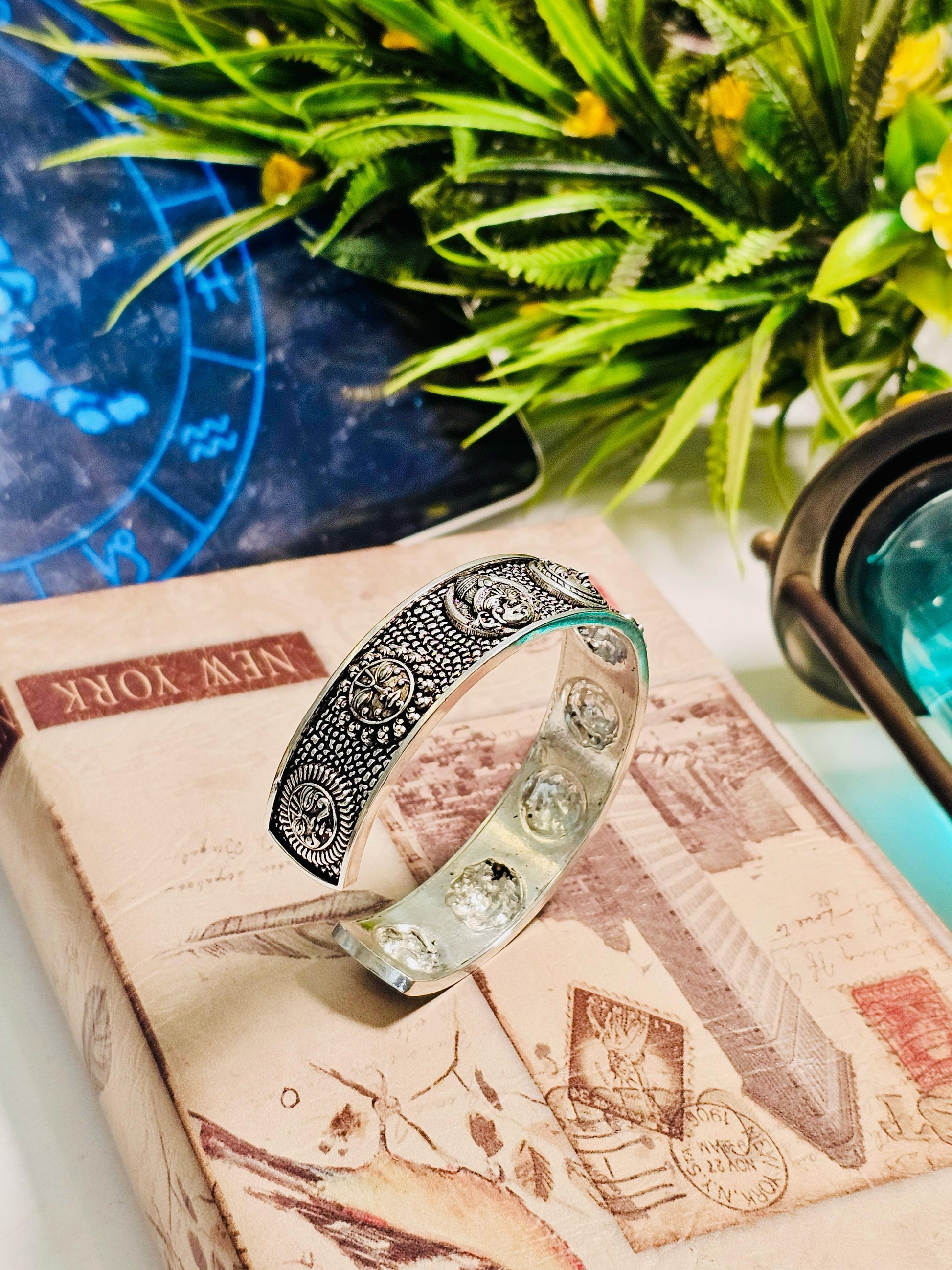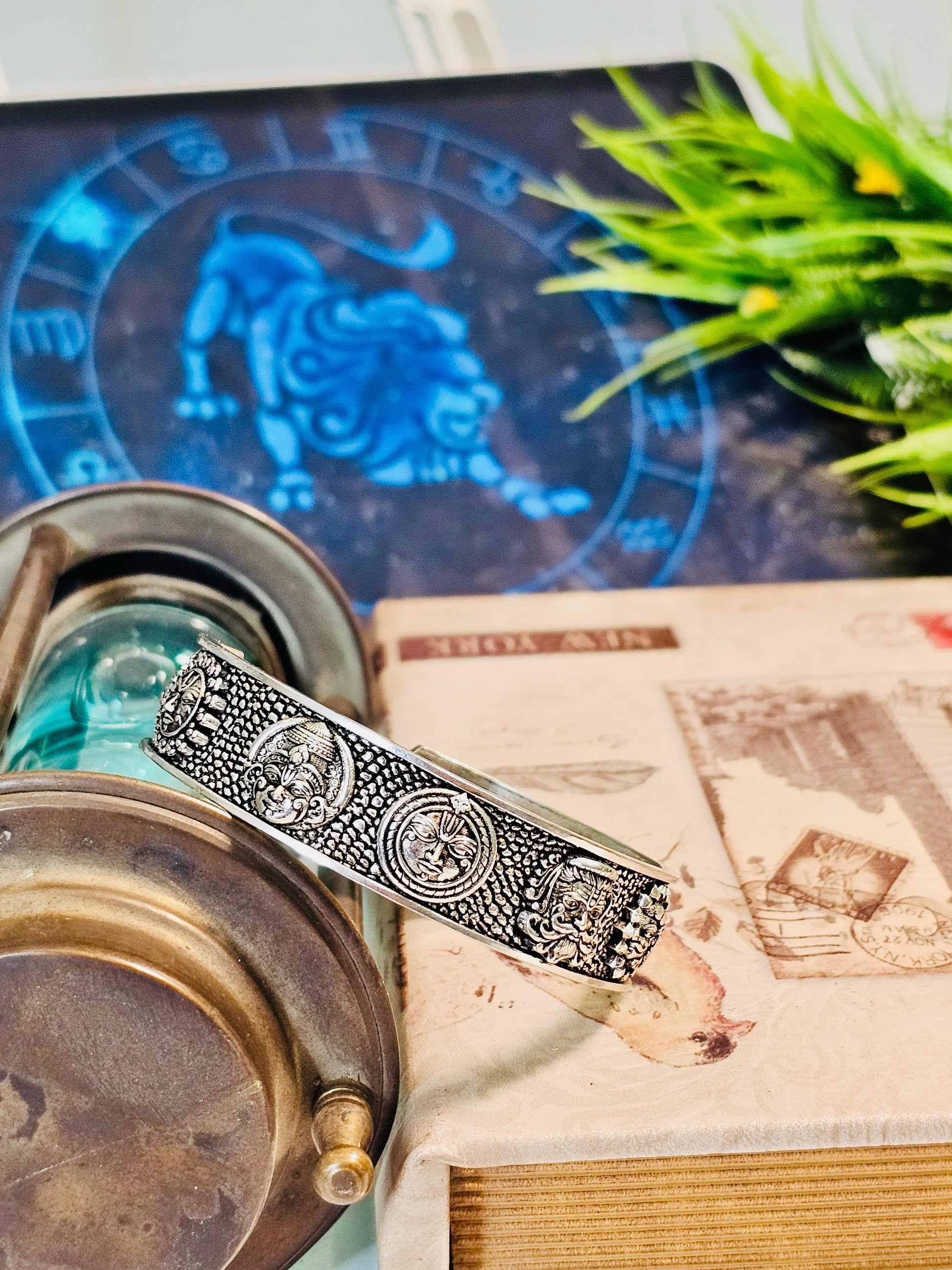 Divine Design – Featuring intricate engravings of Lord Hanuman, this kada embodies his fearless spirit and devotion. The silver plating enhances its elegance while keeping the essence of spirituality intact.